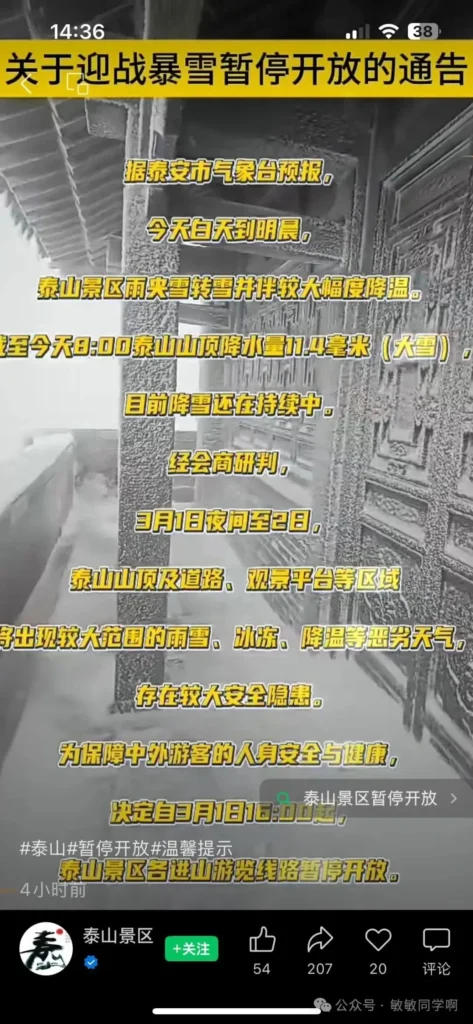 可是剛過了 2 天,就刷到泰山下雪了,要暫停開放。