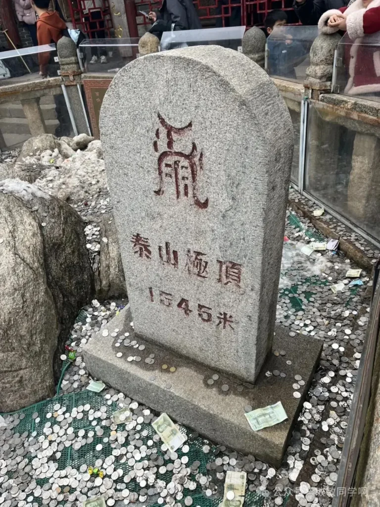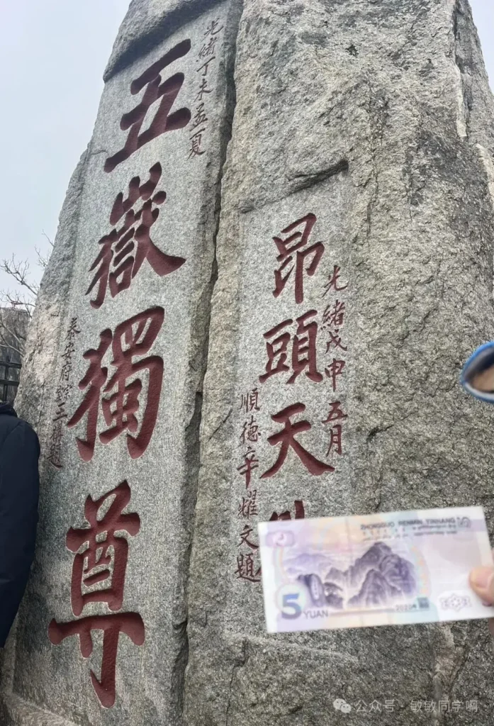 在玉皇頂腳下,我們看到了”五嶽獨尊”的泰山石刻,並拿出準備好的五元人民幣進行合照。了解人民幣背面的地標,帶著娃和紙幣去旅行。