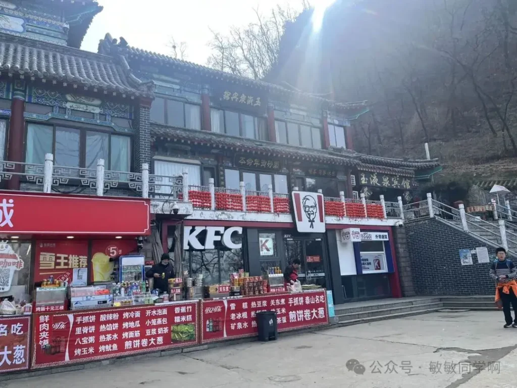 在中天門這個平台,商業很多,有 KFC、蜜雪冰城等,價格也相對實惠。有各類小吃與飲品,烤腸十元三根,礦泉水 2 元一瓶,還有煎餅卷大蔥、鮮肉夾饃、手抓餅等泰山特色小吃與常見餐食。