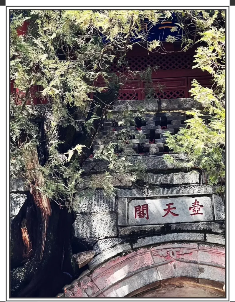 步行約 1 小時後,他們抵達了壺天閣。李女士的父母對古建築頗有興趣,看到壺天閣的城門樓式結構與乾隆御題匾額,不時駐足欣賞,認真閱讀景區的介紹牌。在門洞前,父母被雙柏橫生的奇景所吸引,連連稱讚大自然的神奇,李女士趁機為他們拍了許多照片。
