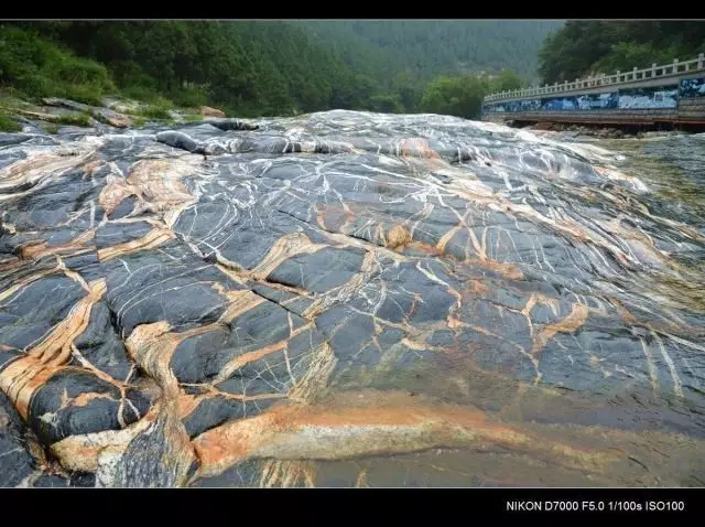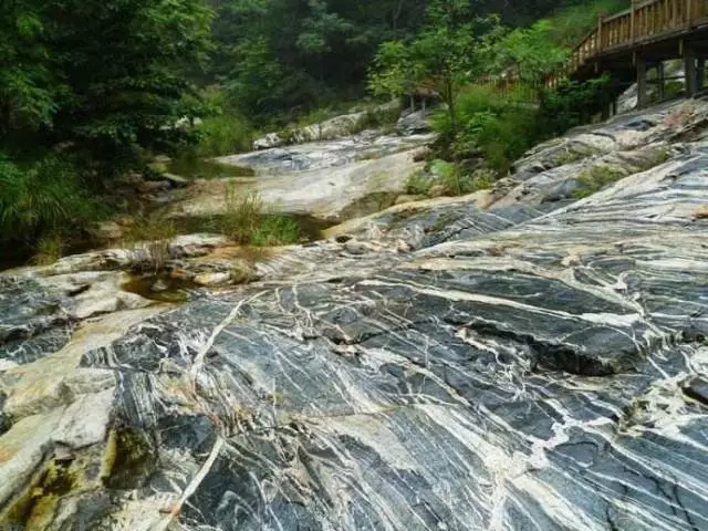 行不遠,達彩石溪,十裏山澗,彩石平鋪。廣闊平坦,色彩斑斕,如天工神筆,精繪妙成。水漫石而流,動靜相契,若瑰麗長卷,飄灑多姿。
