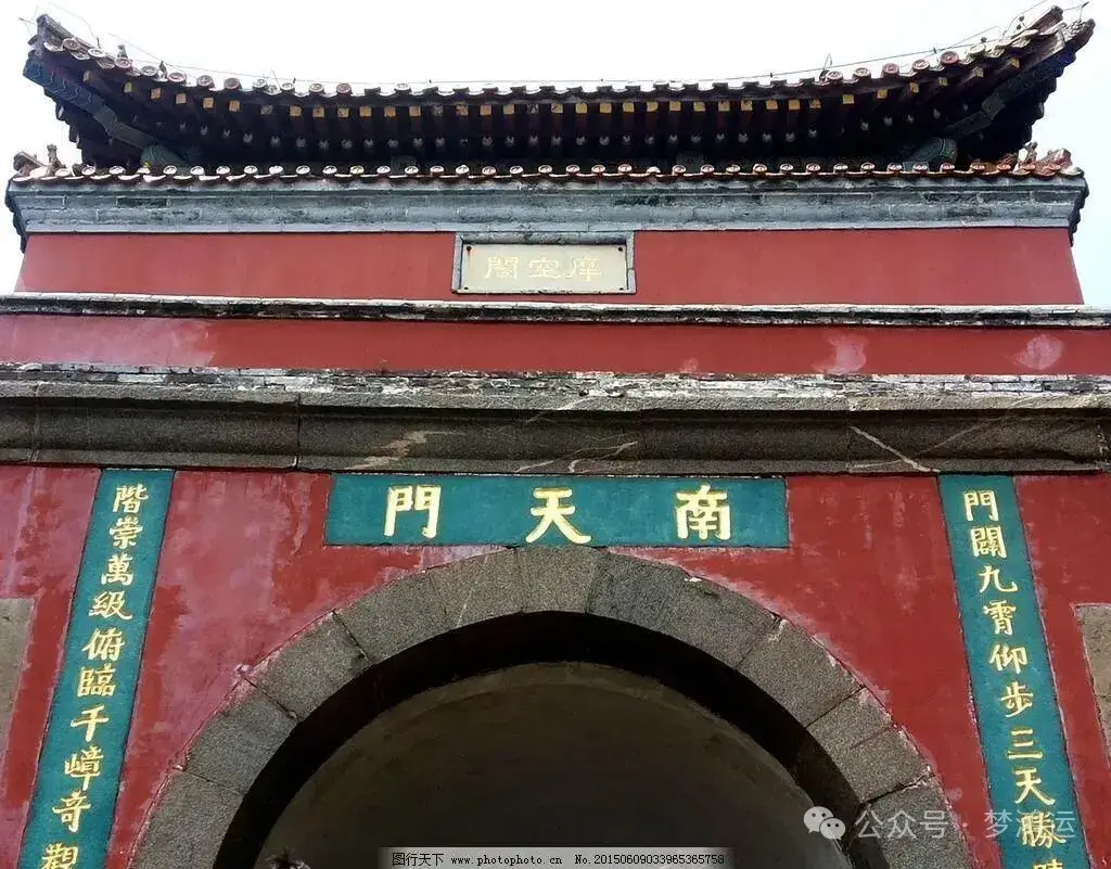 南天門為閣樓式建築,主體由紅牆黃瓦構成,在蒼山翠柏的映襯下顯得氣勢恢宏、莊嚴神聖。城門兩側的楹聯門闢九霄仰步三天勝跡;階崇萬級俯臨千嶂奇觀,精准概括了其地勢之高與視野之闊。閣樓分為上下兩層,下層為拱形城門,可供行人通行;上層為觀景平台,站在此處憑欄遠眺,山下群峰如濤,白雲在峽谷間流動,此前攀登的山路已化為細細的銀線。每當清晨或黃昏,陽光灑在城門的琉璃瓦上,金光閃爍,與周圍的雲霧交織成夢幻的畫面,讓人恍如置身仙境。作為泰山人文景觀的經典之作,南天门不僅是一座建築,更是一種精神符號,標誌著登山者即將迎來頂峰的壯麗風光。
