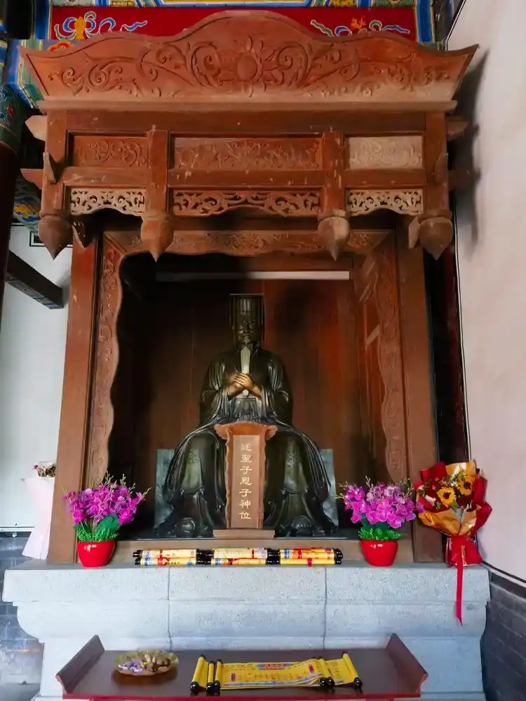 走進山門,首先可見一面影壁牆,中間上方有類似相框的裝飾,兩側配有對聯,牆下方白底紅字書寫 “助您榜上有名”,成為學子們祈福求學的精神寄託。正殿為廟宇核心建築,飛檐斗拱,雕梁畫棟,巍峨壯觀,殿內供奉孔子坐像,正中南向,東西兩側分別配祀顏子、曾子、子思、孟子四位儒家代表人物,合稱 “四配”,體現了儒家學派的傳承脈絡。東側殿為祈福殿,西側殿被闢為財神殿,既延續了祭孔傳統,又融入了民間信仰元素。