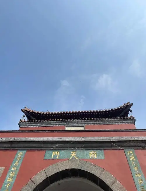 南天門建築分上下兩層,構造精緻,氣勢恢宏。下層為拱形門洞,採用條石壘砌而成,券石起拱頂,四周為冰盤式出檐,東西總長9.65米,南北進深6.26米,高4.7米。中間辟有寬3.7米、高3.25米的拱形門洞,門上鑲貼金匾額,書“南天門”三個大字,筆力遒勁,熠熠生輝。門兩側刻有經典楹聯:“門辟九霄仰步三天勝跡,階崇萬級俯臨千嶂奇觀”,精准概括了南天門的雄偉氣勢與所處位置的獨特景觀。