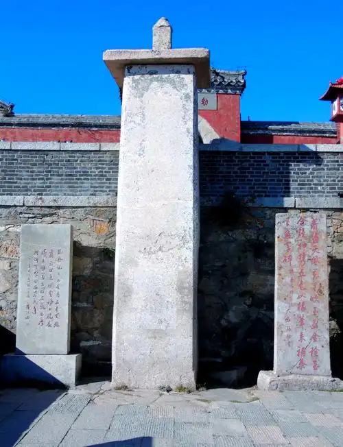 泰山極頂玉皇廟前的無字碑,通高近 6 米,由石柱、頂蓋石和頂柱石三部分組成,通體無一字痕,其立石人與年代歷來眾說紛紜。
