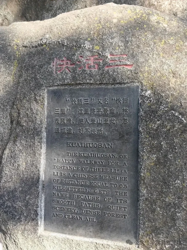 “快活三” 又名 “快活三里”,這裡路平景曲,林茂風清,遊人登山至此,忽遇坦途,好不快活。進入泰山徒步最具挑戰性的十八盤之前的這一段,我們跟古人的感受完全相通。