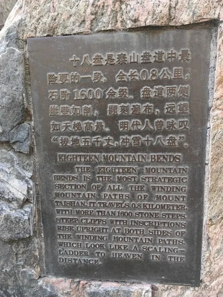 十八盤全長 800 米,1600 餘級台階,垂直落差 400 米,是泰山盤道中最險要的一段,盤道兩側崖壁如削,題刻遍佈,遠望如天梯高懸,明代人曾詠歎 “拔地五千丈,沖霄十八盤”。