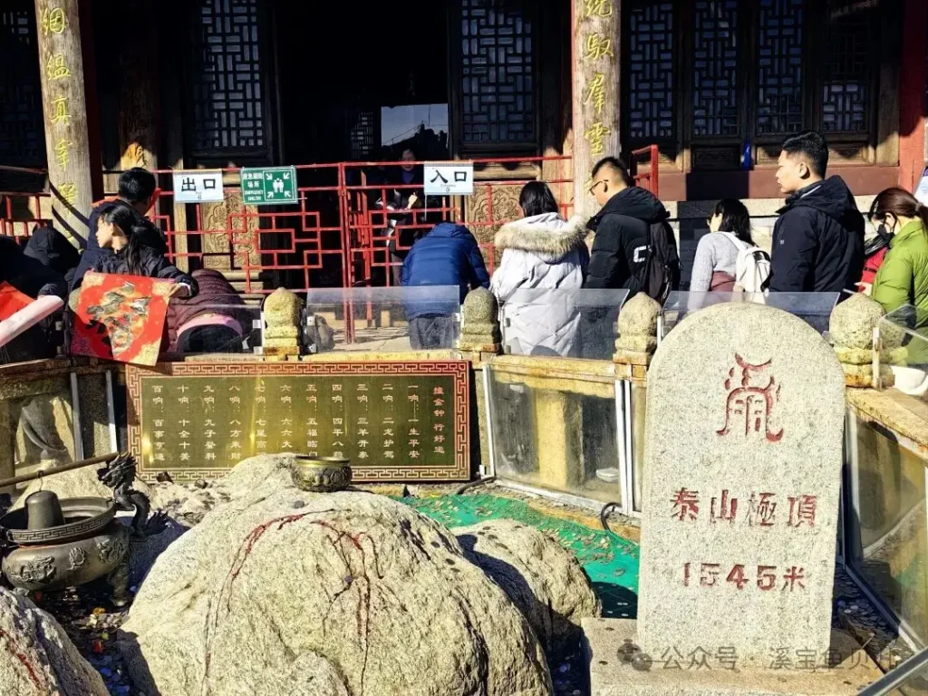 碧霞祠是泰山頂上最大的古建築群,供奉泰山女神碧霞元君,民間親切稱作泰山奶奶,香火極旺,檐角銅鈴在風中清響。我沒進去燒香,只是在院子裡站了一會兒,默默為家人許了許願。