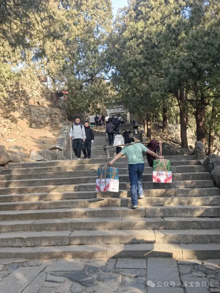 路上偶遇當代挑山工,一路用手機外放著動感十足的音樂。隨著時代發展,泰山之路越來越便利,不再只用腳步丈量世界,一路上只遇到這一個挑山工。