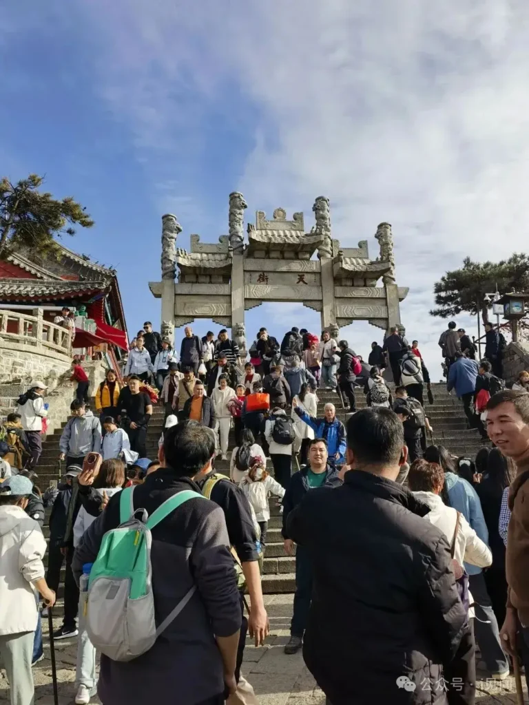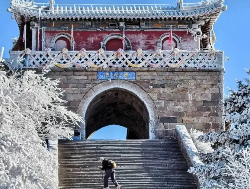 等爬到南天門,風更大了,忍不住駐足遠眺,天地間白茫茫一片,連空氣都清冽得沁人心脾,所有的疲憊瞬間消散大半。