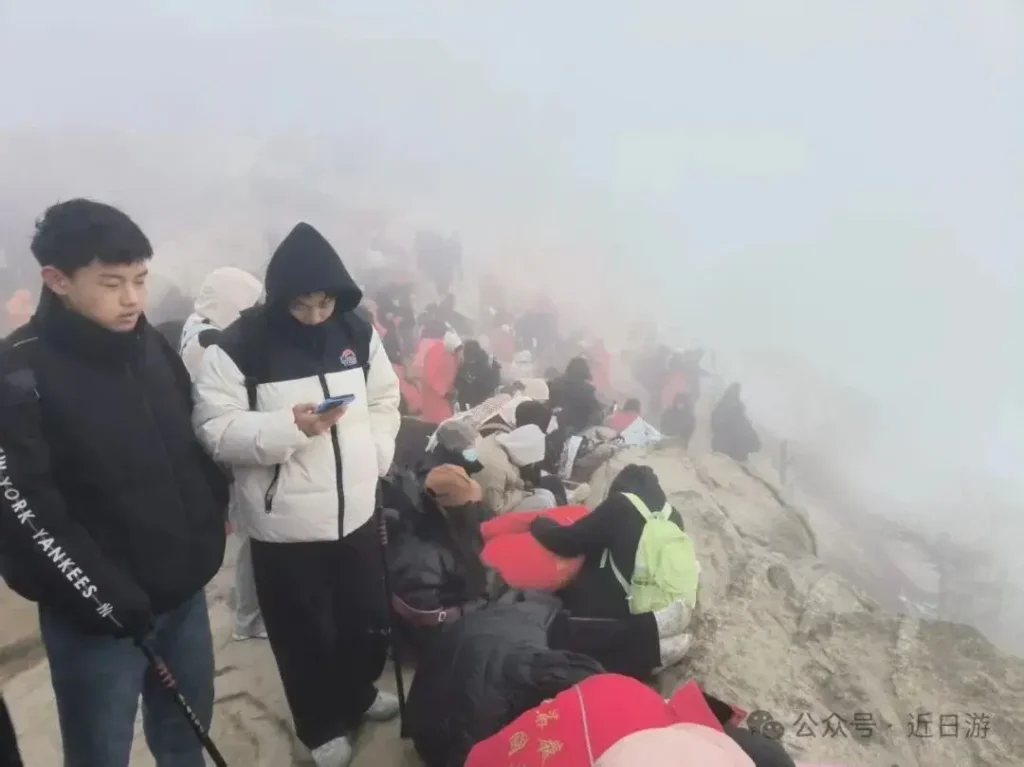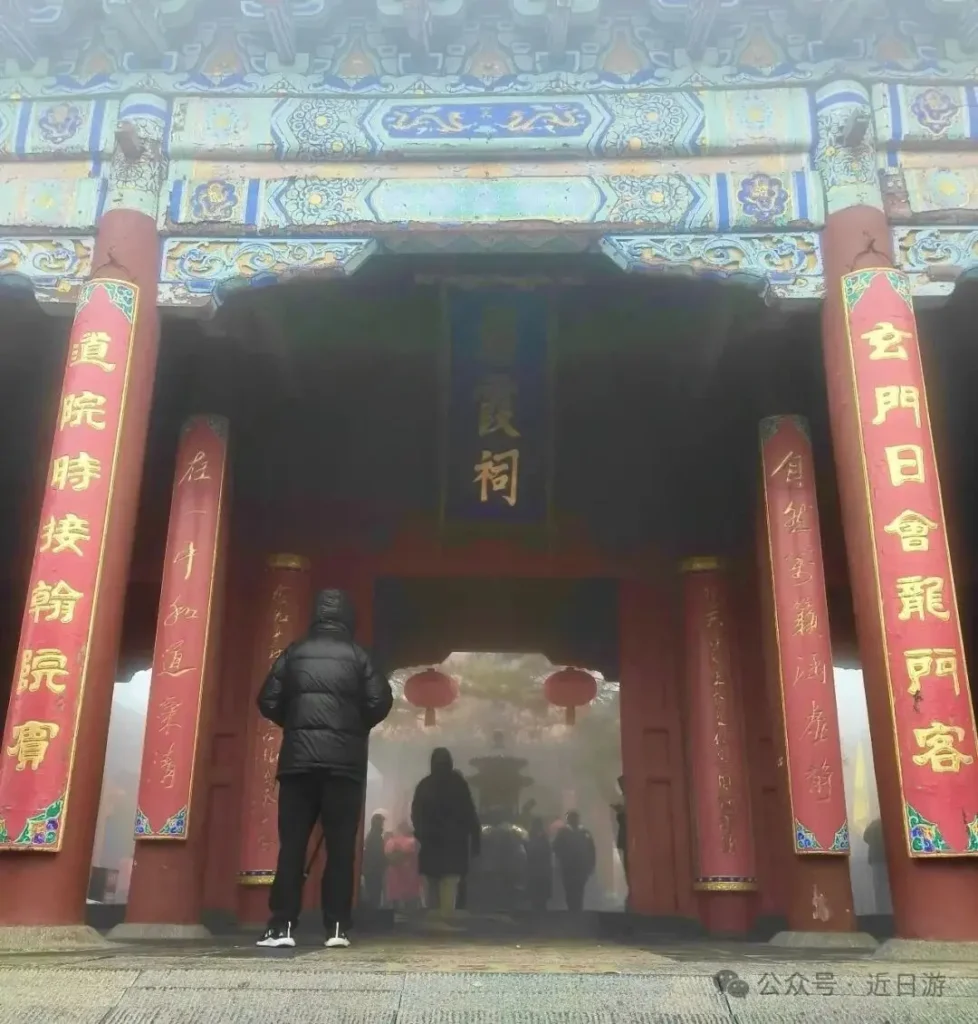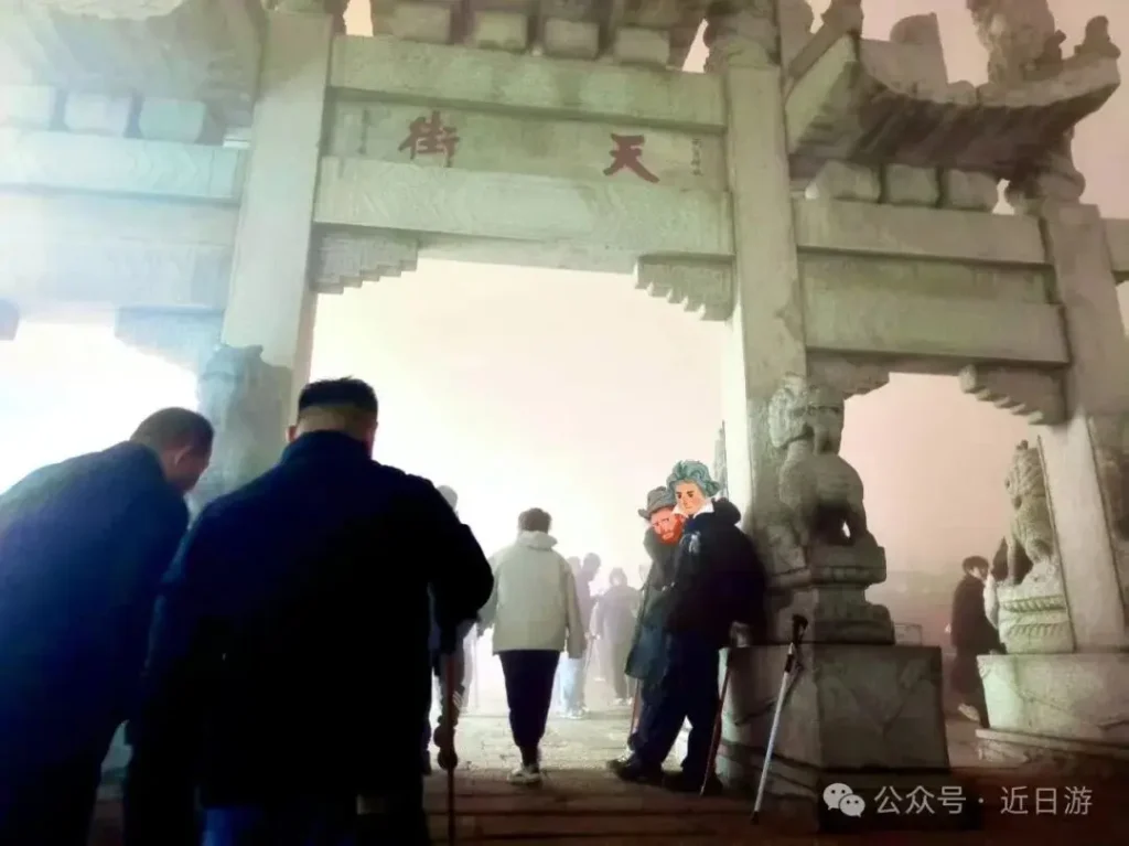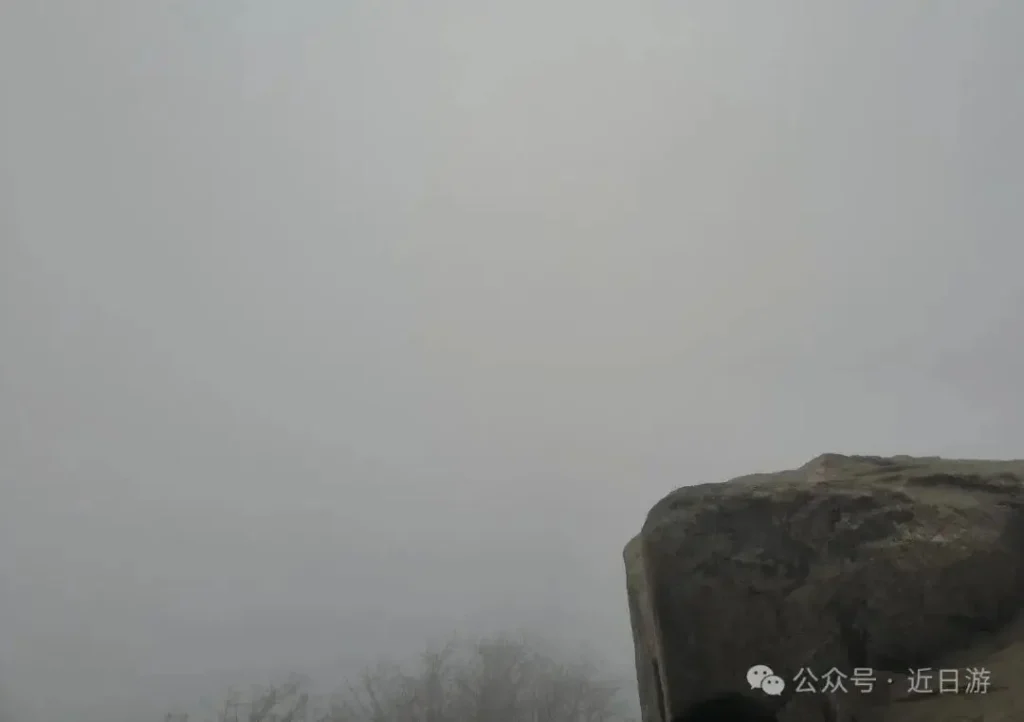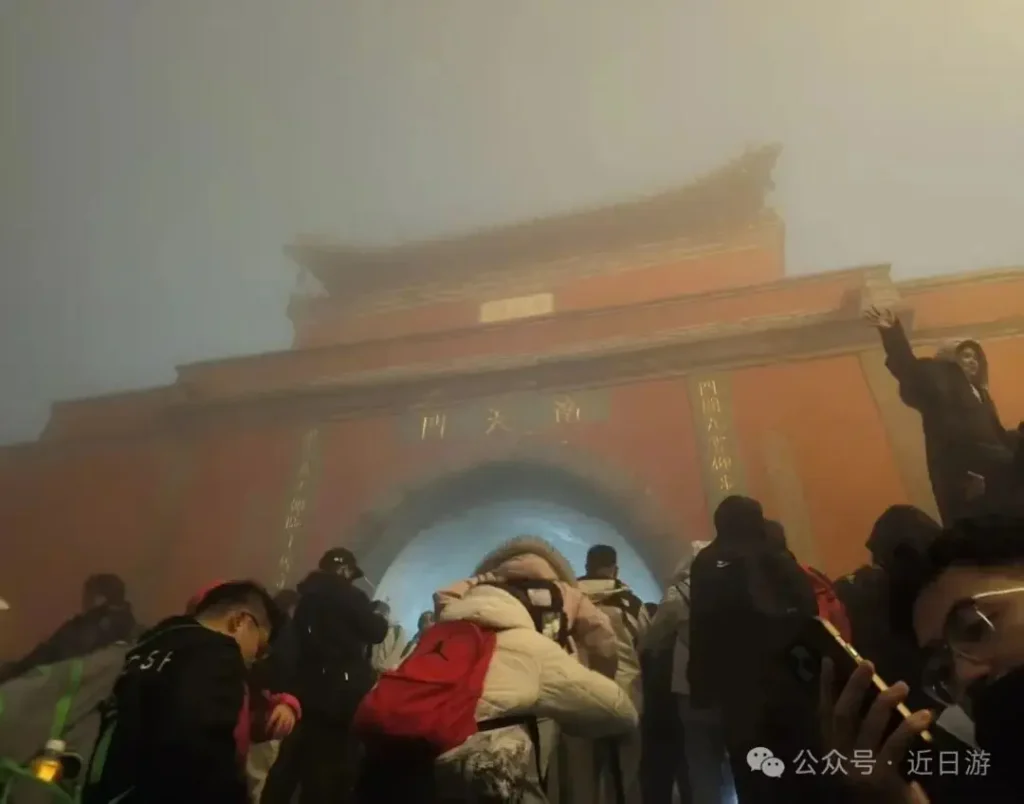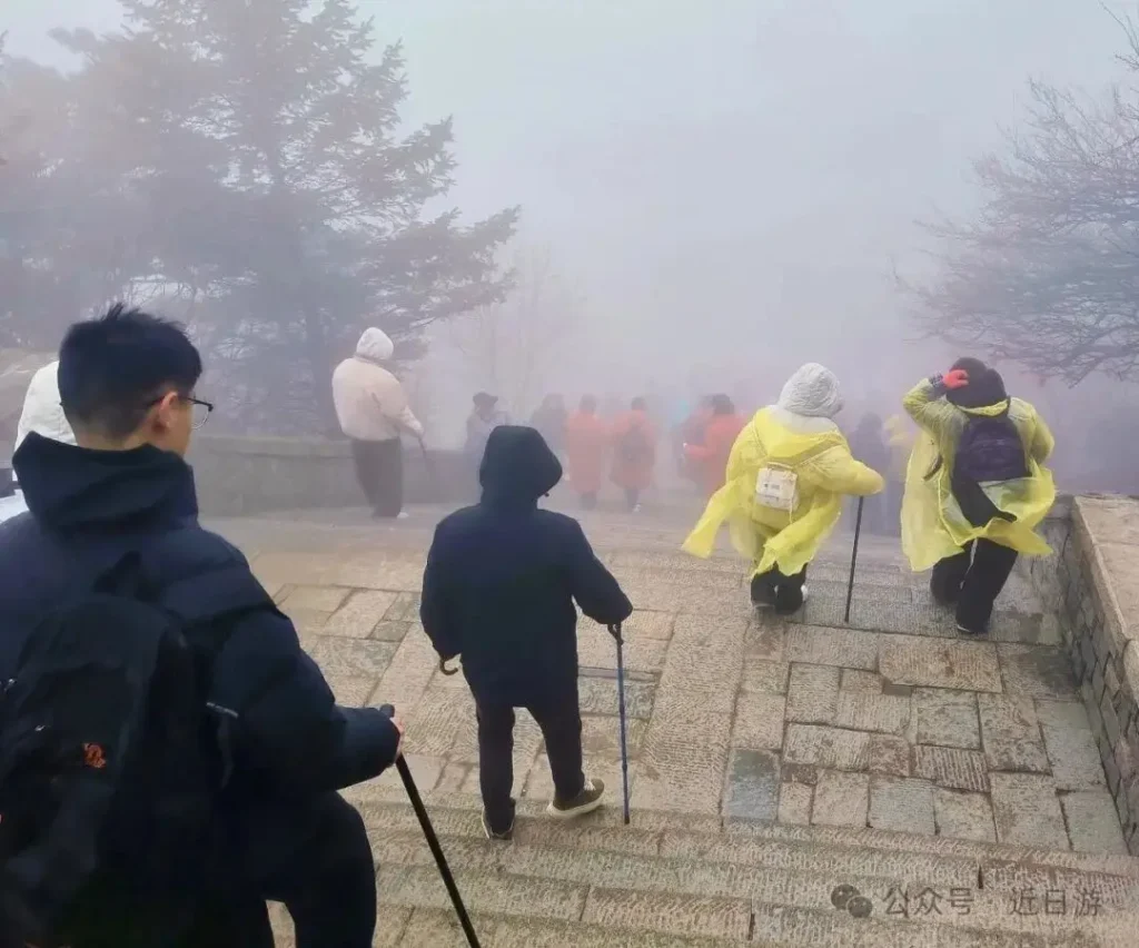 04 點 23 分,我們決定在碧霞祠門口休息一段時間。霧濃得五米外就看不見人,姚鼐當年寫的 “道中迷霧冰滑”,此刻才真正懂了。空氣裡的水汽凝結成細密的水珠,凝結在樹上,風吹過就落在臉上、手上、衣服上,像下了一場看不見的雨。